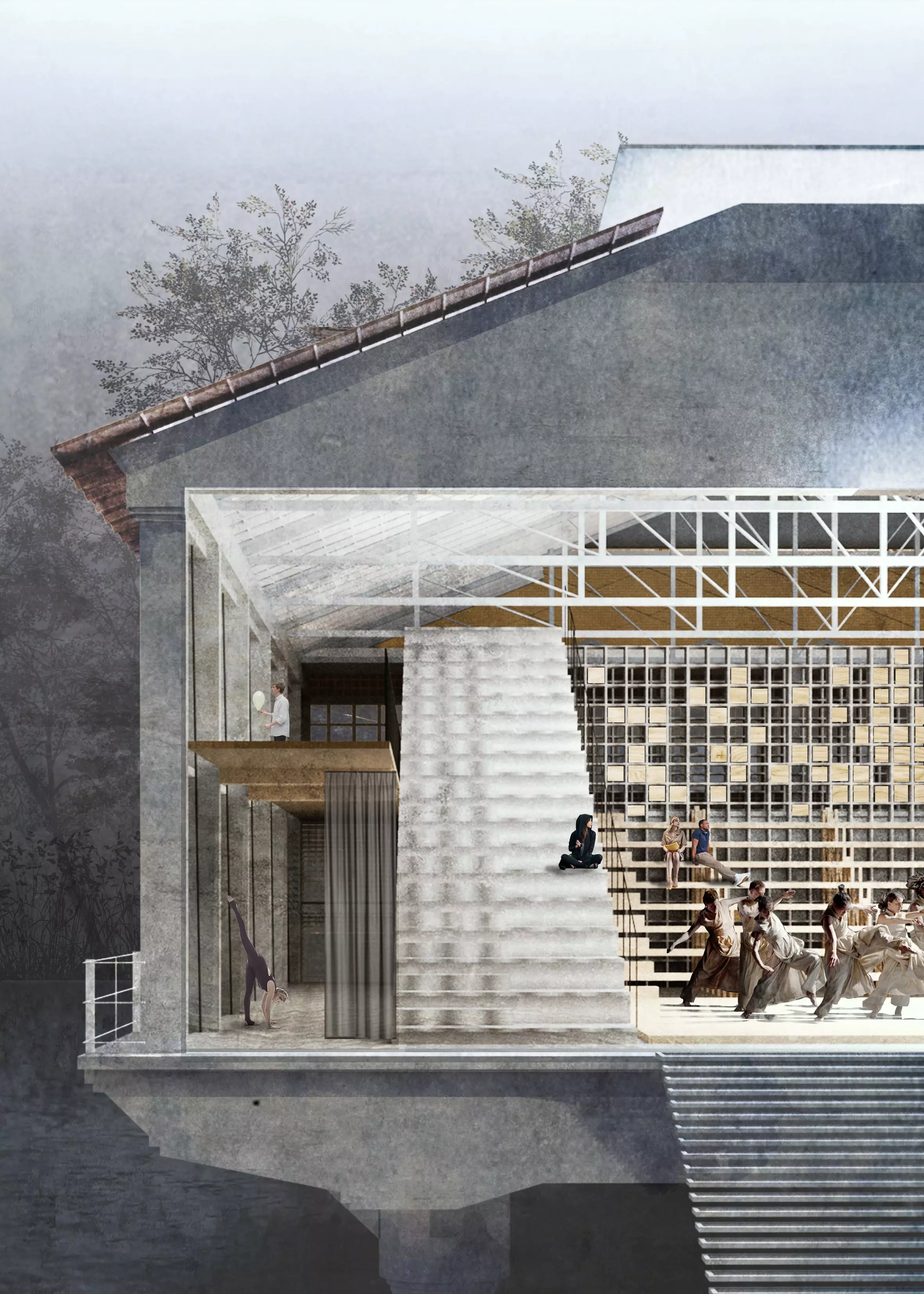 Forma projektowanego budynku nawiązuje do typologii teatru szekspirowskiego. Schody przy elewacji i tarasy okalają przestrzeń centralną, która jest platformą z elementami mobilnymi. Ruchome elementy umożliwiają otrzymanie różnych konfiguracji scena-widownia, a także utworzenie przestrzeni warsztatowej. Przedstawienia mogłyby się odbywać na tle otwartej przestrzeni zewnętrznej z widokiem na rzekę.