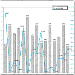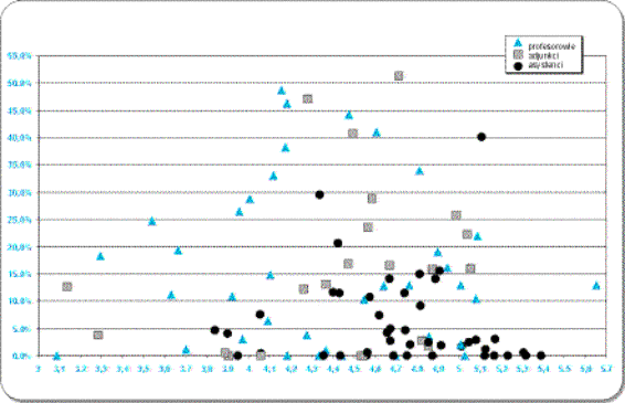 Oto przykład efektów obróbki danych. Wykres 1. przedstawia jednocześnie, jakie oceny od studentów uzyskali poszczególni nauczyciele (słupki) i jak wyglądał procent ocen niedostatecznych wystawionych przez daną osobę (czarna linia z oznaczonymi punktowo wartościami). Uzyskane z analiz dane można przedstawić również na zbiorczym wykresie 2., na którym profesorowie, adiunkci i asystenci zaznaczeni są osobnymi symbolami (odpowiednio – trójkąty, kwadraty, kółka).