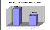 Dziennik „Rzeczpospolita” (nr 250 z 2.10.03) na jednej z czołowych stronic zamieścił „demaskatorski” artykuł (podpisany A.P.) zatytułowany Ile kosztuje student z nadtytułem wskazującym wyraźnie, na czyje zamówienie i z jaką tezą artykuł ten był pisany: Państwowe uczelnie droższe niż niepaństwowe. W tekście cytowane są wyłącznie wypowiedzi wiceministra edukacji Tadeusza Szulca oraz przewodniczącego Konferencji Rektorów Uczelni Niepaństwowych prof. Józefa Szabłowskiego. Ten ostatni poucza rektorów uczelni państwowych twierdząc: (...) w państwowym szkolnictwie są znaczne rezerwy obniżenia kosztów, a także podaje diagnozę, wyjaśniającą, skąd się bierze dysproporcja kosztów kształcenia jednego studenta w szkołach publicznych i niepublicznych: Uczelnie niepaństwowe są zagrożone bankructwem, więc muszą bardzo rozsądnie prowadzić gospodarkę finansową – mają wielki przymus racjonalizacji wydatków. A mówią, że państwowy uniwersytet nie może zbankrutować. Tezy te w „Rzeczpospolitej” ilustruje „bijący po oczach” wykres, porównujący roczny koszt kształcenia jednego studenta w uczelniach państwowych, tych rozrzutnie marnotrawiących społeczne pieniądze, bo nie zagrożonych bankructwem, oraz niepaństwowych, dających przykład dobrej gospodarności i wiedzących lepiej od rektorów szkół państwowych, jak wielkie rezerwy ukrywają oni w swoich budżetach. Wykres ten pozwalam sobie przytoczyć na rysunku 1.