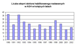 Na moją prośbę stosowne dane dosłały mi wszystkie polskie uczelnie techniczne z wyjątkiem politechnik: Świętokrzyskiej i Radomskiej, a także państwowej Wyższej Szkoły Morskiej w Szczecinie. Zebrane dane dotyczące doktoratów, habilitacji i tytułów profesorskich, obrazujące aktywność w zakresie kształcenia kadr naukowych 21 uczelni w okresie 14 lat, stworzyły obraz ciekawy, ale zbyt bogaty, żeby go tu w całości przytaczać. Analizę utrudniał głównie fakt (wcześniej przeze mnie nie do końca przewidywany), że rozpiętość liczb podawanych w każdej kategorii przez poszczególne uczelnie była bardzo duża; duże szkoły miały naprawdę imponujący dorobek w tym zakresie, podczas gdy małe uczelnie (spełniające wszelako kryteria stawiane przez KRASP do tego, by uczelnię uznać za akademicką!) wykazywały w niektórych dziedzinach dorobek wręcz śladowy. Do wątku tego jeszcze powrócę. Co więcej, badane procesy zdobywania stopni naukowych wykazywały silne losowe fluktuacje w konkretnych kolejnych latach (co jest zrozumiałe, jeśli uwzględni się sposób osiągania tych szczebli kariery przez poszczególnych naukowców). Dla ilustracji tego zjawiska przytaczam na rysunku 2. zmienność liczby doktoratów, habilitacji i tytułów profesorskich zdobywanych w podlegającym rozważaniu okresie w jednej badanych uczelni (z oczywistych powodów wybrałem AGH).