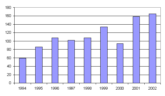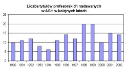 Na rysunku 3. pokazano czasową zmienność sumy tytułów profesorskich uzyskiwanych we wszystkich uczelniach technicznych w kolejnych latach. Na rysunku tym łatwo zauważyć tendencję rosnącą, która potwierdza tezę o zwiększającym się wysiłku uczelni technicznych także i w tej sferze ich działalności. Jednak widać także, iż z procesem uzyskiwania tytułów naukowych (a także stopni naukowych, czego już nie przytaczam dla oszczędności miejsca) wiążą się duże oscylacje losowe.