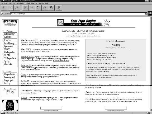 Pod adresem http://www.reporter.pl/ znajdziemy Serwis Informacyjny „REPORTER”. Różni się on tym od wielu innych serwisów internetowych, że zawiera między innymi BAZĘ WIEDZY, jak piszą autorzy strony: miejsce skupiające setki ekspertów z różnych dziedzin wiedzy. Setek na razie nie znalazłem, wszystkich nazwisk jest pewnie kilkadziesiąt, ale i to dobre na początek. Baza podzielona jest według dyscyplin, w ramach których podane są adresy e-mailowe ekspertów. Można się z tymi osobami skontaktować, zadać im pytanie. Pośród nauk matematyczno-przyrodniczych dostępni są eksperci z astronomii, biologii, geografii i geologii, sztucznej inteligencji, matematyki, fizyki i chemii. W dyscyplinach społecznych znajdziemy mnóstwo kategorii. Są także działy: kultura, technika, ekonomia i biznes. Kategorie pogrupowano nie zawsze według czytelnych kryteriów. Warto to zrobić porządnie i fachowo, zanim serwis się rozrośnie. Kim są eksperci BAZY WIEDZY? To prawdopodobnie ludzie młodzi. Nie znajdziemy wśród nich znanych profesorskich nazwisk, ale też trudno byłoby się tego spodziewać. Najważniejsze, aby byli kompetentni.