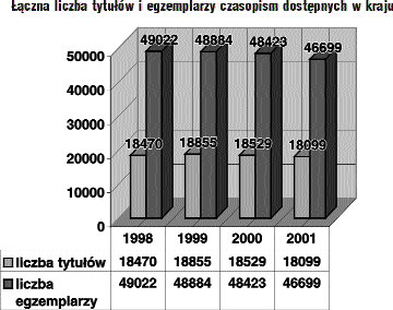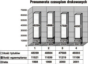 tym zakresie. TENDENCJA SPADKOWAKorzystną sytuację potwierdzają informacje dotyczące zmian dokonywanych w bibliotekach w poszczególnych latach. W latach 1998-1999 wycofywano wprawdzie z prenumeraty znaczną liczbę tytułów czasopism, ale jednocześnie wprowadzano nowe tytuły. Od roku 2000 zarysowuje się wyraźna tendencja spadkowa. Na podstawie wstępnych informacji z bibliotek naukowych tendencje te w roku 2002 powiększą się i, jak przewiduje się, w największym stopniu będą widoczne w bibliotekach największych uczelni, stanowiących podstawowy warsztat naukowo-edukacyjny dla całego kraju.