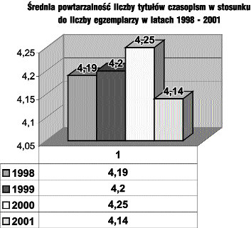 Biorąc pod uwagę fakt, że część tytułów nadchodzi jednocześnie z prenumeraty i z wymiany, łączną liczbę tytułów i egzemplarzy czasopism dostępnych w kraju przedstawia Rys. 5. Średnia powtarzalność, czyli liczba tytułów w stosunku do liczby egzemplarzy,