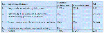 W roku 2001/02 naukę na studiach wyższych pobierało 1718,7 tys. osób, w tym w uczelniach niepaństwowych (łącznie z uczelniami organizacji wyznaniowych) 509 279, czyli 29,6 proc. całej populacji. Jakie są finanse uczelni państwowych i niepaństwowych? Czy szkoły niepaństwowe to dobry biznes? Jak przedstawiają się finanse uczelni niepaństwowych na tle państwowych? Są to pytania, na które odpowiedź możemy uzyskać stosując pewne przeliczenia i komentarze do danych zawartych w publikacji GUS. Na wstępie wypada jednak stwierdzić, że poprzez analizę finansów można w znacznym stopniu ocenić działalność jednostki, jej gospodarność i racjonalność działań obecnych i przyszłych. Przez pryzmat finansów można też oceniać politykę edukacyjną organów państwowych. UDZIAŁ W PKBW Polsce udział wydatków publicznych na szkolnictwo wyższe w 2001 r. wynosił 0,89 proc. PKB. W wybranych krajach wskaźnik ten, łącznie z subsydiami dla szkół prywatnych (1998), wynosił: we Włoszech 0,68 proc., w Wielkiej Brytanii 0,83 proc., w Hiszpanii 0,84 proc., w Niemczech 0,97 proc., we Francji 1,01 proc. W Polsce prywatne uczelnie, poza Katolickim Uniwersytetem Lubelskim i Uniwersytetem Kardynała Stefana Wyszyńskiego w Warszawie, subsydiów ani dotacji budżetowych w zasadzie nie otrzymują. W roku 2001 udział wydatków w PKB w naszym kraju wynosił: z budżetu państwa – 0,89 proc., z opłat za studia w uczelniach państwowych i niepaństwowych – 0,44 proc., razem – 1,33 proc. W sumie udział wydatków na szkolnictwo wyższe w Polsce był wyższy niż w takich krajach, jak: Włochy – 0,84 proc. PKB, Niemcy – 1,04 proc. PKB, Francja – 1,1 proc. PKB, Wielka Brytania – 1,1 proc. PKB. Społeczeństwo polskie wykazywało dużą skłonność do angażowania swoich pieniędzy w zdobywanie wyższego wykształcenia. Skłonność ta w proc. PKB była wyższa niż w krajach Europy Zachodniej. Udział wydatków na szkolnictwo niepaństwowe jest relatywnie niski, w 2001 r. wynosił 0,22 proc. PKB. Udział ten w ogólnych wydatkach społeczeństwa na edukację na poziomie wyższym wynosił 16,5 proc. i nie był proporcjonalny do udziału studentów kształconych przez uczelnie niepaństwowe, który wynosił 30 proc. W sumie udział wydatków na szkolnictwo wyższe, liczony w procentach PKB, był stosunkowo wysoki, choć 1 proc. PKB co innego oznacza w Polsce i w Niemczech w kwotach globalnych. WYNIK FINANSOWY I JEGO PODZIAŁZysk netto uczelni państwowych wyniósł 358,5 mln zł, a niepaństwowych – 327,7 mln zł. Porównanie tych liczb wskazywałoby, że uczelnie niepaństwowe są bardziej rentowne. Jednak nie można tak stwierdzić, ponieważ wyniki te kształtują się w odmiennych warunkach metodologicznych i nie są porównywalne. W uczelniach niepaństwowych wynik finansowy w większości został przeznaczony na działalność statutową. Z wyniku tego finansowane są m.in. inwestycje. W roku 2001 szkoły niepaństwowe przeznaczyły na inwestycje i remonty kapitalne kwotę 363,9 mln zł, a więc znacznie więcej niż zysk bilansowy netto (327,7 mln zł). Dodatkowe sumy pochodziły z wpłat założycieli, kredytów i amortyzacji. Na podstawie tych liczb można jednoznacznie stwierdzić, że uczelnie niepaństwowe przeznaczają wypracowane nadwyżki na rozwój swojej bazy materialnej i jest to z pewnością ich atut. Zysk przeznaczony na cele inne niż statutowe w uczelniach państwowych i niepaństwowych jest niewielki i wynosi około 2 proc. globalnej sumy zysku. PRZYCHODY UCZELNIUczelnie uzyskują przychody z następujących tytułów: dotacji z budżetu na działalność dydaktyczną i badania naukowe, odpłatności za zajęcia dydaktyczne i pozostałych źródeł. Ważną rolę spełnia też pomoc materialna dla studentów. Przychody uczelni państwowych i niepaństwowych w roku 2001 przedstawiono w tablicy 1. W tablicy 1 przedstawiono dane liczbowe w przeliczeniu na jednego studenta dziennego i zaocznego łącznie. Jest to uzasadnione tym, że: KOSZTY KSZTAŁCENIAKoszty kształcenia są prawie 2,5-krotnie wyższe w uczelniach państwowych w przeliczeniu na jednego studenta. W roku 2001 wynosiły one: w uczelniach państwowych 6997 zł, w niepaństwowych – 2852 zł. Z czego wynikają te różnice? Przedstawiciele uczelni państwowych najczęściej twierdzą, że szkoły niepaństwowe nie prowadzą badań naukowych. Jednak nie jest to do końca prawdą. Wszystkie uczelnie, które uzyskały uprawnienia do prowadzenia studiów magisterskich, muszą wykazać się prowadzeniem badań naukowych i zostało to potwierdzone przez ekspertów MENiS. Wydatki na badania naukowe w uczelniach niepaństwowych nie są objęte statystyką, co zaniża procent wydatków na te badania w PKB. Przychody z działalności badawczej szkół państwowych są objęte statystyką i ich wielkość tylko w niewielkim stopniu może tłumaczyć różnice w kosztach. Wyniki badań dla gospodarki, co potwierdzają kolejne wydania rocznika statystycznego GUS, są raczej malejące. W latach 1990-2000 liczba udzielonych patentów na wynalazki zmniejszyła się prawie 3,5-krotnie, a liczba udzielonych praw ochronnych w tym okresie obniżyła się ponaddwukrotnie. Oczywiście, przedstawiciele nauki będą narzekali na małą aktywność praktyki gospodarczej, a przedstawiciele życia gospodarczego na słabą pomoc płynącą ze strony nauki. Wzajemne narzekania nie rozwiążą jednak problemu.