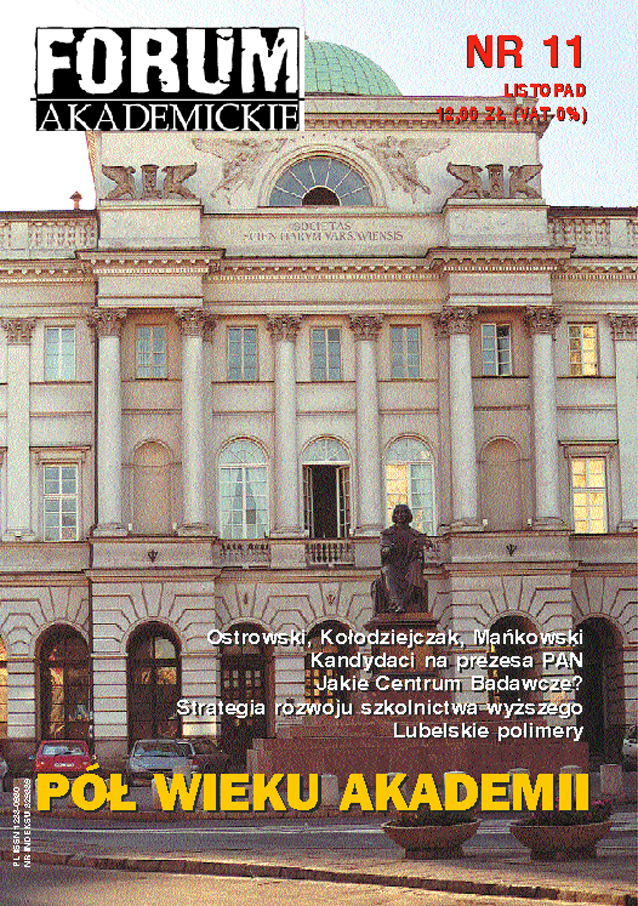 Publikujemy blok materiałów związanych z jubileuszem 50-lecia Polskiej Akademii Nauk. Znalazły się w nim: relacja z konferencji „PAN – wczoraj, dziś, jutro”, rozmowy z czterema kandydatami na stanowisko prezesa Akademii – prof. Andrzejem Kajetanem Wróblewskim, prof. Andrzejem B. Legockim, prof. Mieczysławm Mąkoszą i prof. Henrykiem Ratajczakiem, artykuł prof. Andrzeja Białynickiego-Biruli o przyszłości Centrum Badawczego PAN, a także obszerny esej prof. Jerzego Kołodziejczaka, p.o. prezesa PAN na temat wyzwań stojących dziś przed Polską akademią Nauk.