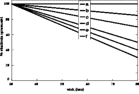 Rysunek 1. Zmiany fizjologicznej sprawności z wiekiem [Shock, 1972].