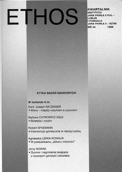 Ukazał się nowy zeszyt kwartalnika "Ethos" (nr 4/98) poświęcony problemom etyki badań naukowych i dylematom rozwoju nauki, numer bardzo ciekawy, który warto polecić naszym Czytelnikom. Ogólnym rozważaniom o etyce nauki towarzyszy w tym zeszycie blok tekstów dotyczących szczegółowych problemów etyki w badaniach genetycznych oraz artykuły związane z encykliką Jana Pawła II Fides et ratio.