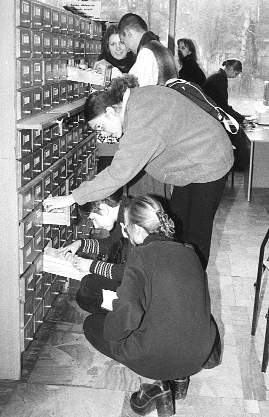 Nasze oczekiwania rozmijają się z oczekiwaniami studentów już przy pierwszym spotkaniu. Zakładamy, że student IV bądź V roku jest wieloletnim użytkownikiem biblioteki, w szczególności biblioteki naukowej, i poza elementarną wiedzą o zasadach "poruszania się" w tej instytucji, potrafi np. wypełnić rewers, rozumie znaczenie słów "katalog" czy "bibliografia" i potrafi posługiwać się tymi źródłami informacji. Niestety, znakomita większość studentów w sposób świadomy odwiedza bibliotekę po raz pierwszy przy okazji gromadzenia literatury do pracy magisterskiej. Wcześniejsze wizyty to, poza lekcją biblioteczną na I roku, kontakt z biblioteką na poziomie katalogu alfabetycznego i wypożyczalni. Studenci ostatnich lat studiów trafiają do miejsca, które jawi się im jako nieznany i wrogi labirynt. Zanim zatem przystąpimy do zaawansowanych poszukiwań w bazach bibliograficznych, musimy im opisać ponownie topografię budynku, wyjaśnić, gdzie stoją katalogi i czym się od siebie różnią, czym jest komputerowy katalog biblioteki a czym baza bibliograficzna, przeszukiwana za pomocą komputera, do czego służy bibliografia i dlaczego to właśnie narzędzie jest podstawowe przy pisaniu pracy magisterskiej. Wielokrotnie zdarzało się nam wyjaśniać znaczenie sygnatury jako elementu lokalizującego miejsce książki w magazynie, ponieważ studenci nie widzieli celowości umieszczenia tego "numerku" na rewersach.