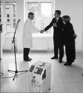 20 kwietnia prof. Andrzej Szczeklik, kierownik II Katedry Chorób Wewnętrznych Collegium Medicum UJ, odebrał z rąk przedstawiciela Linde Gaz Polska (na fot.) 20 przenośnych koncentratorów tlenu Heimox 590 Ska o wartości ponad 100 tys. zł. Urządzenia są wykorzystywane przy przewlekłych chorobach płuc. Umożliwiają prowadzenie terapii tlenowej w domu pacjenta. Stanowią one ułatwienie dla osób w stanie nierokującym szans wyleczenia, wydatnie poprawiając jakość życia oraz umożliwiając zwiększoną aktywność.